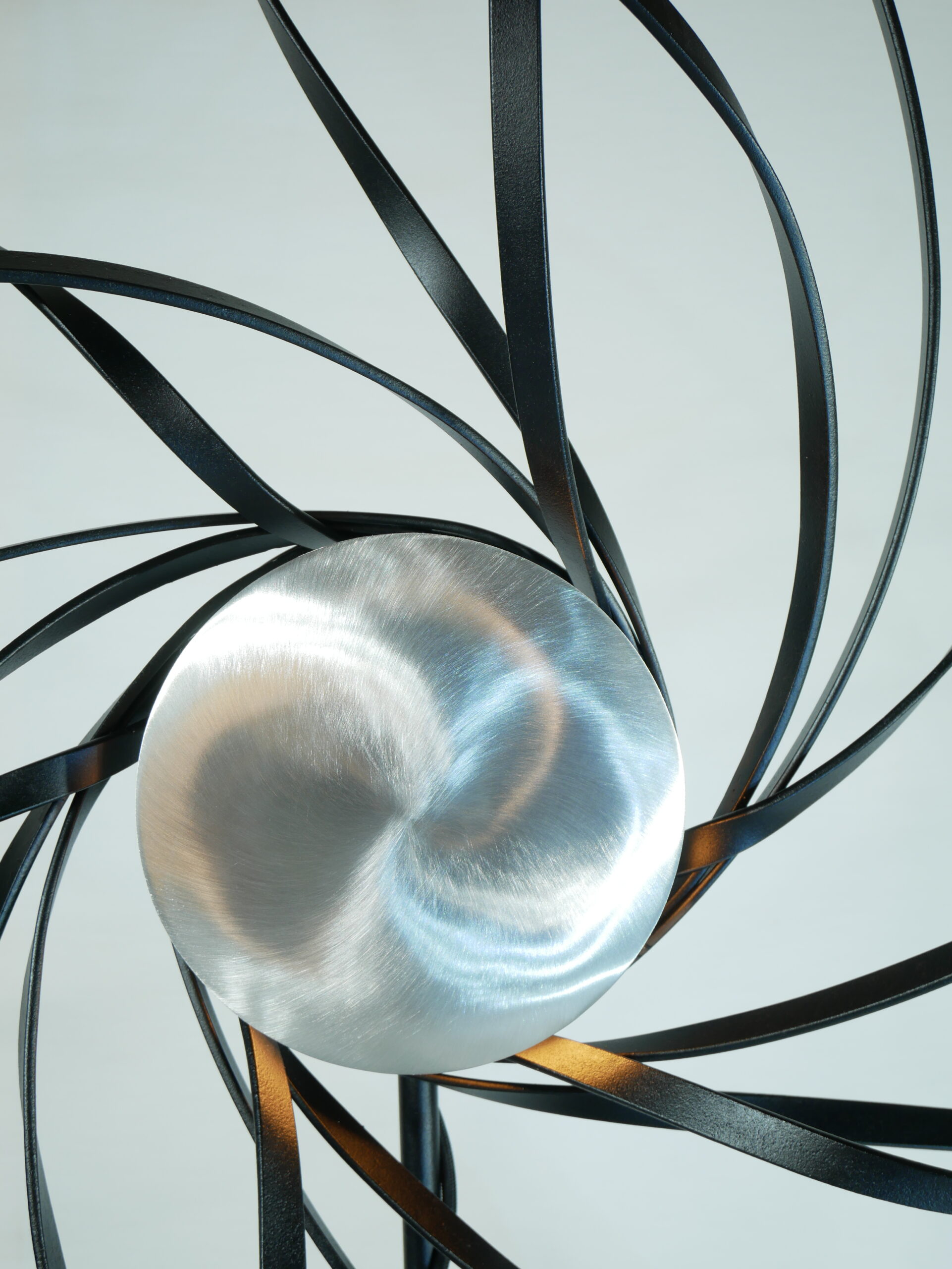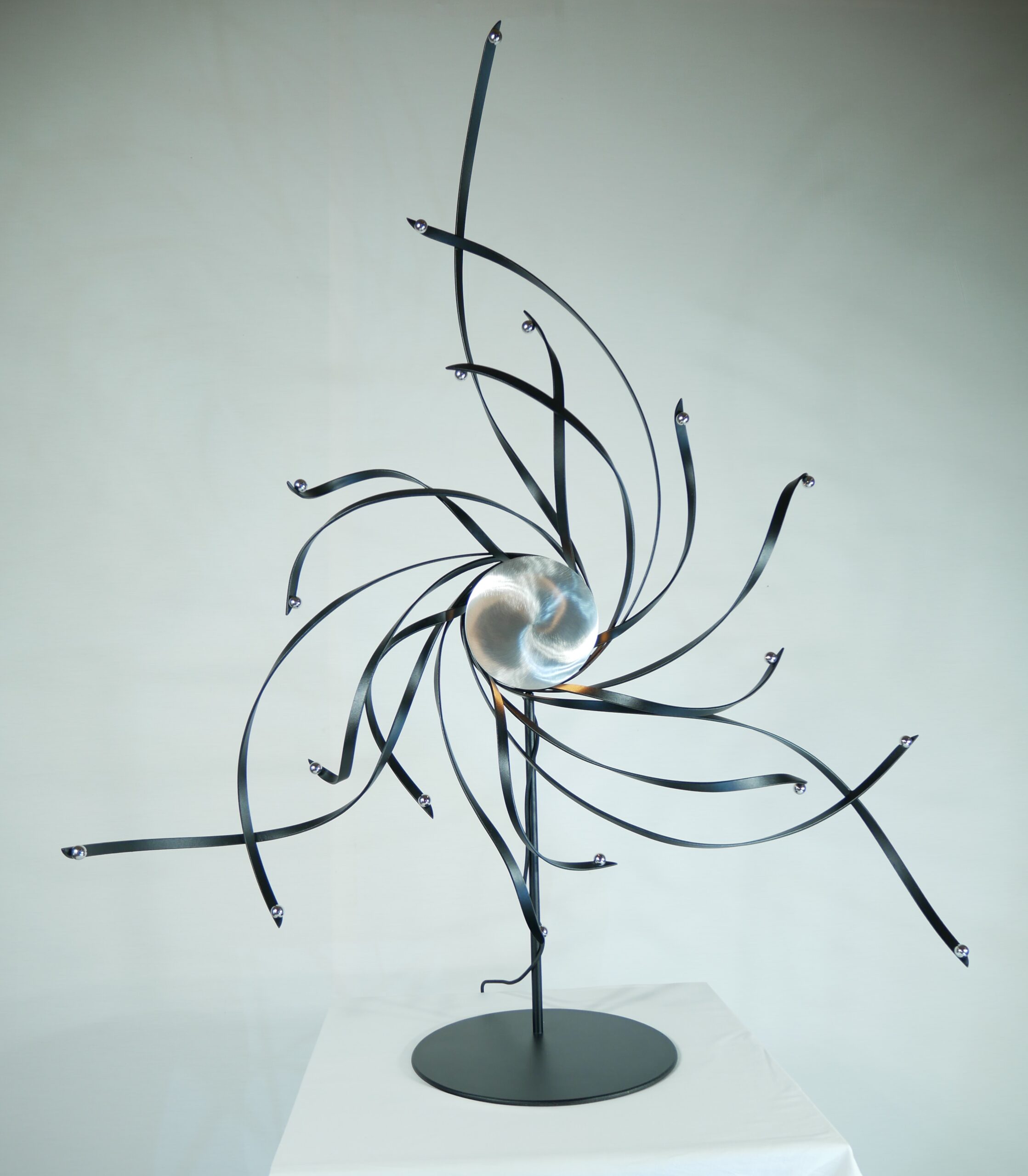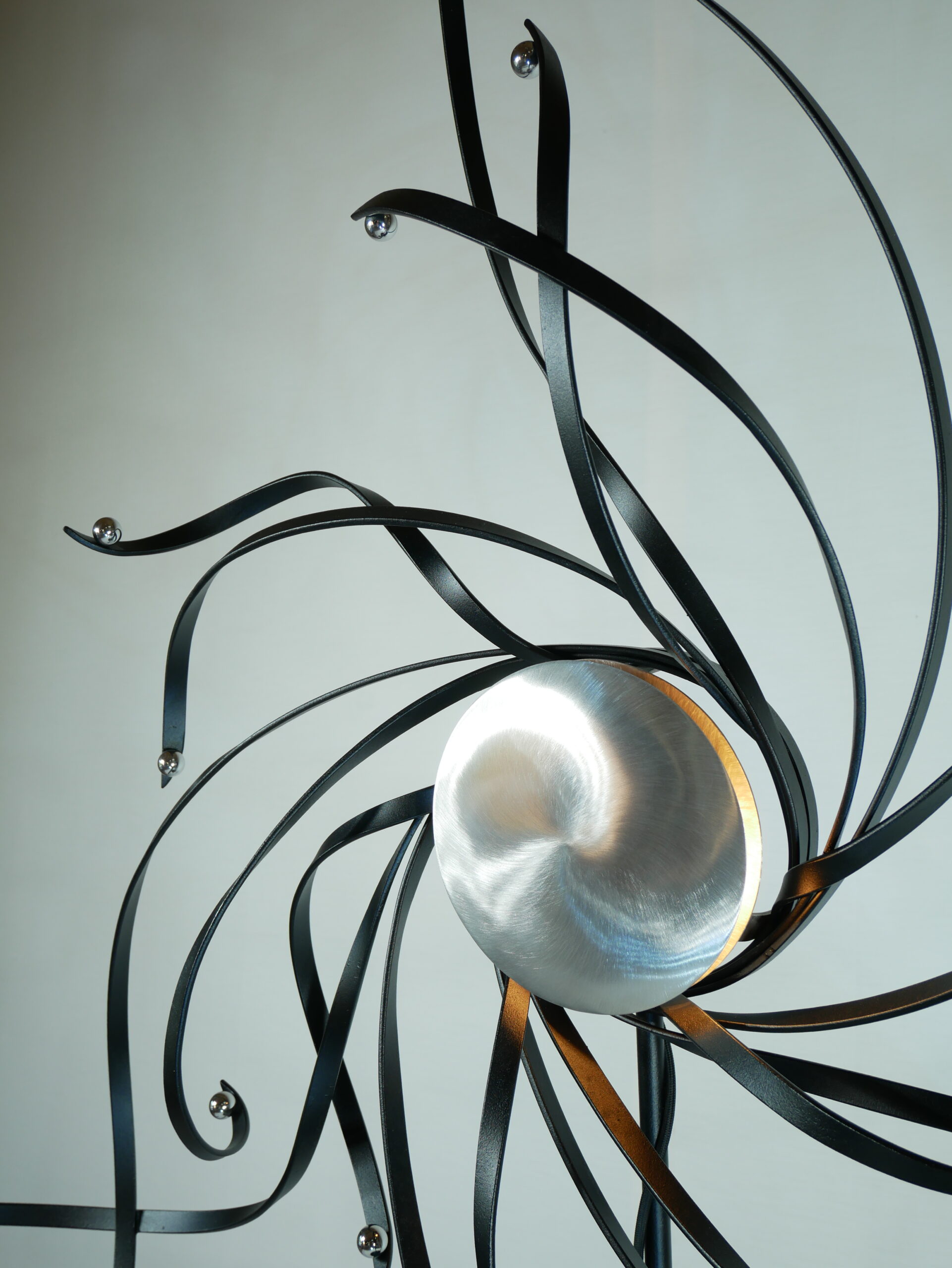 Cette sculpture avec son design organique, ses courbes fluides et ses lignes métalliques torsadées, évoque des mouvements naturels comme des tourbillons ou des rayonnements cosmiques. Cette esthétique dynamique donne une impression de vie et de mouvement, capturant l’énergie d’un instant figé.