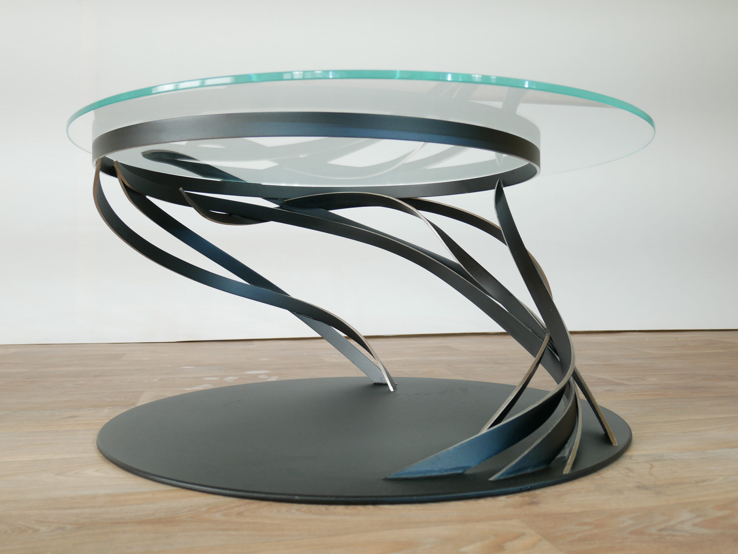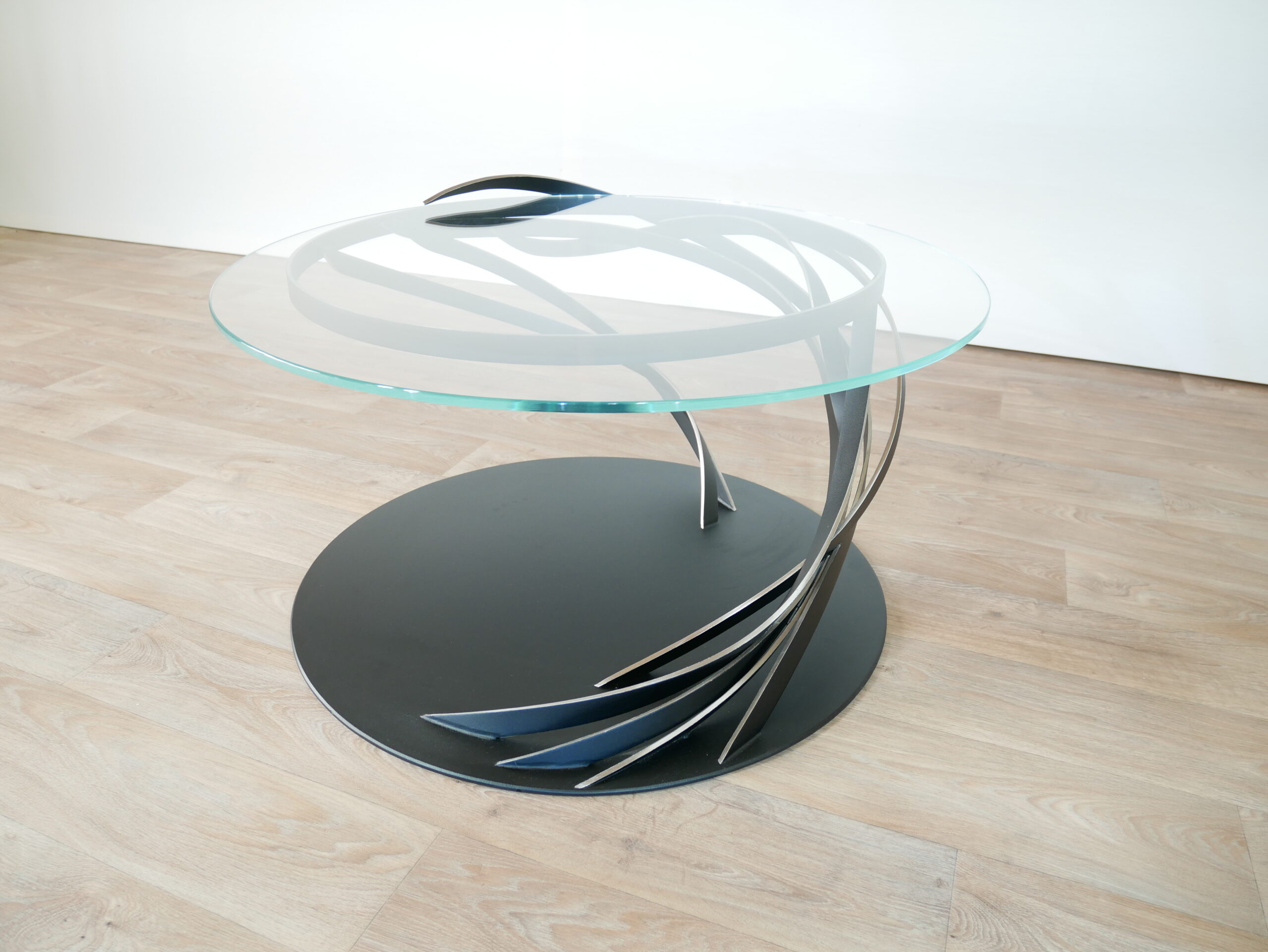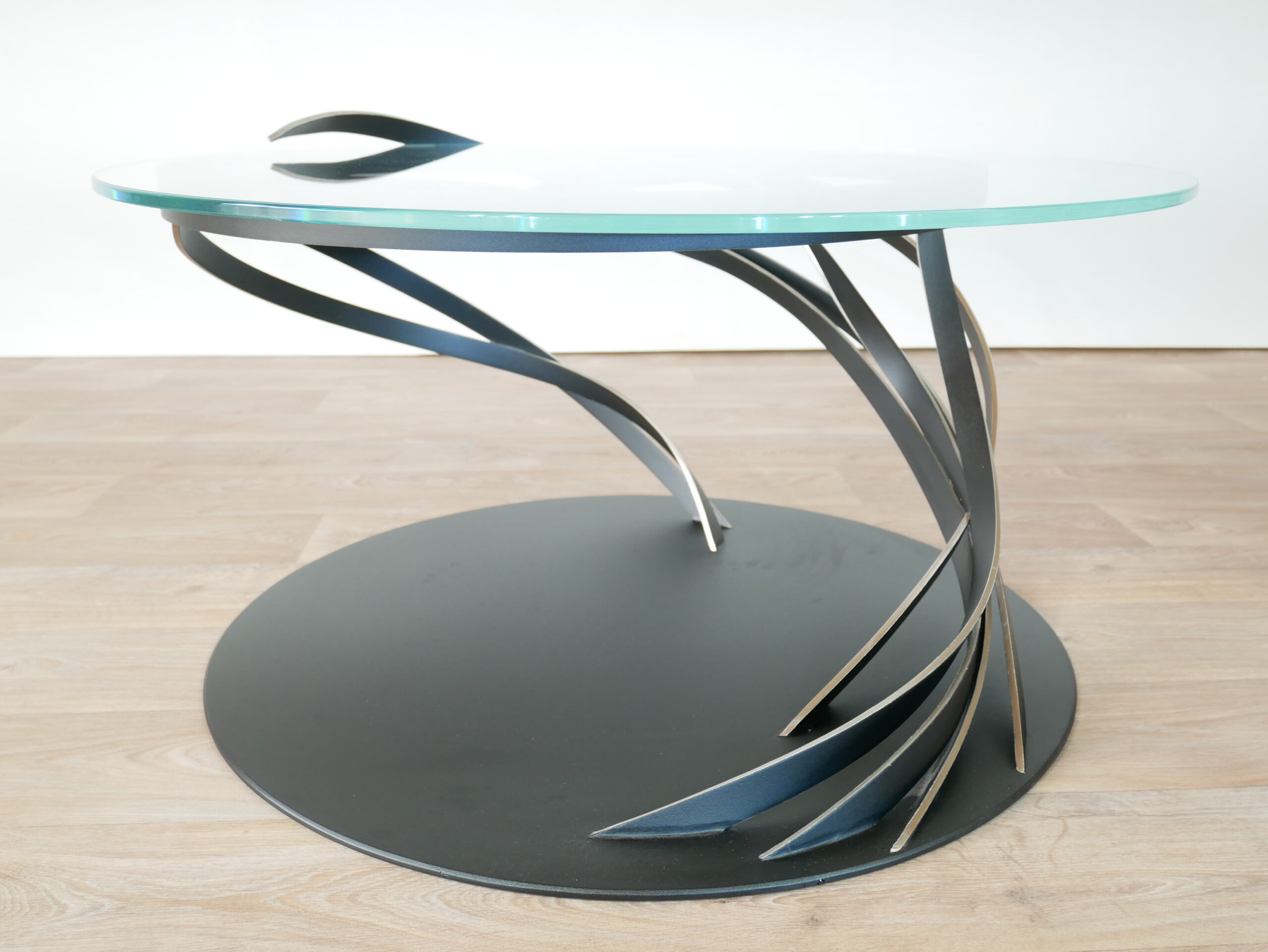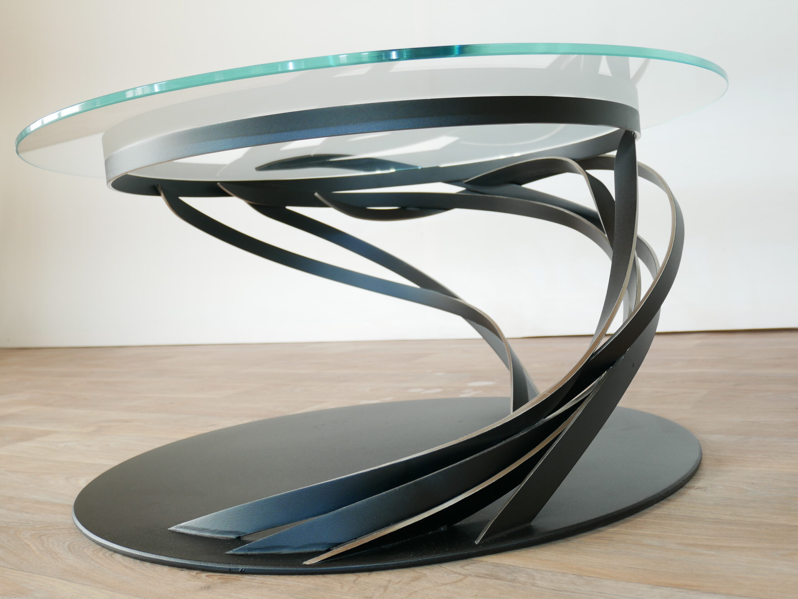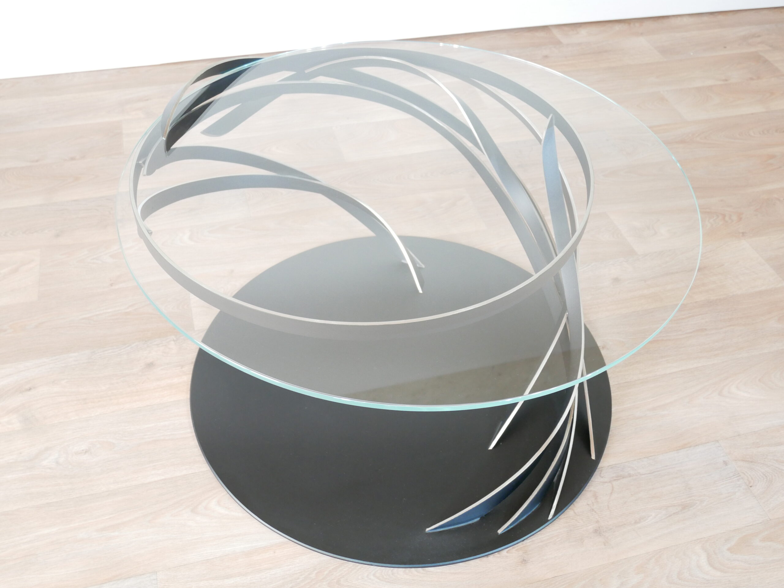 Cette table basse au design contemporain allie élégance et dynamisme, évoquant le mouvement grâce à des courbes en métal noir et acier brossé. Le plateau en verre transparent met en valeur sa structure sculpturale et légère. Mariant esthétisme et fonctionnalité, elle illustre un dialogue entre art et mobilier, où des matériaux industriels s’inscrivent dans une démarche artistique raffinée. Une pièce unique qui conjugue modernité et poésie visuelle.